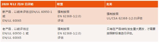由各個授權(quán)的 NRTL 認(rèn)證機構(gòu)獨立運作, 使用相同的標(biāo)準(zhǔn) UL/CSA 62368-1(2.0)的要求,所以 2.0 版的強制實施日期由各家 NRTL 授權(quán)認(rèn)證機構(gòu)自行決定。 通常各 NRTL 機構(gòu)會采納與 UL 發(fā)布的相同的實施日期。 目前 UL 發(fā)布的強制實施日期和歐盟的相同, 也是2020 年 12 月 20 日。但是有一個很大的不同點要注意, 此日期只針對新申請的產(chǎn)品或是老產(chǎn)品做了重大結(jié)構(gòu)更改(如主要電路改變)的情況, 對于已經(jīng)按照 UL/CSA 60950-1 和UL/CSA 60065 評估的產(chǎn)品, 如果未有重大結(jié)構(gòu)更改, 到了此日期以后, 不用強制升級評估 UL/CSA 62368-1(2.0)。
