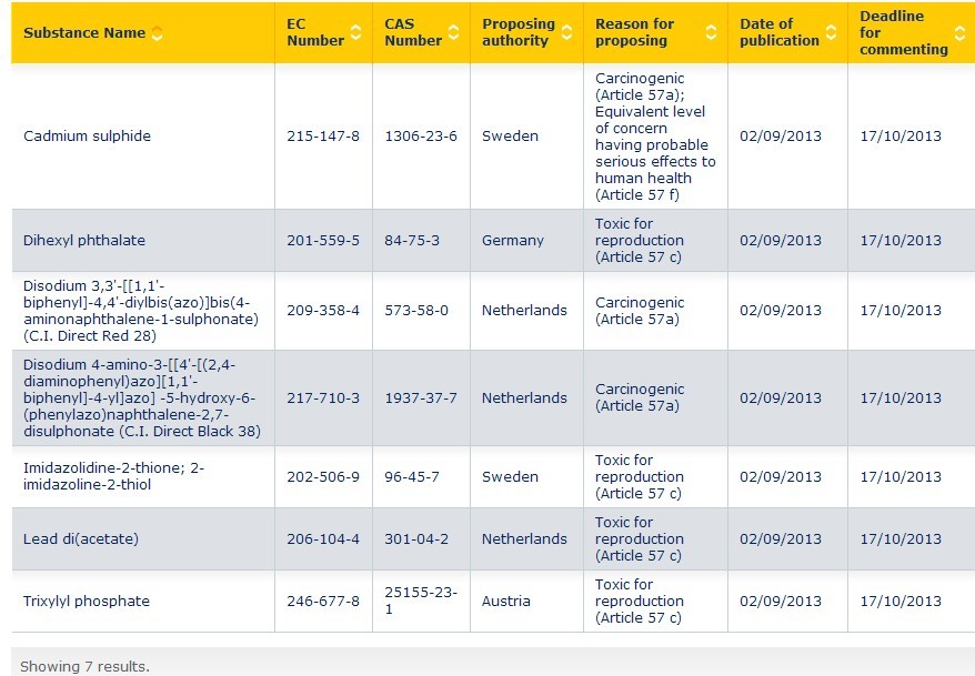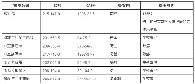 2013年9月2日,ECHA在其官網(wǎng)上發(fā)布了第十批七種擬列入SVHC清單的物質(zhì)進行公眾咨詢,公眾意見截至日期為2013年10月17日。詳情如下表所示。