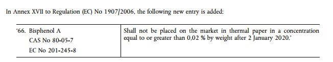 雙酚A(Bisphenol A) CAS NO 80-05-7 ,EC No 201-245-8 在2020年1月2日之后,雙酚A濃度等于或大于0.02%(按重量計)的熱敏紙不能投放到市場上