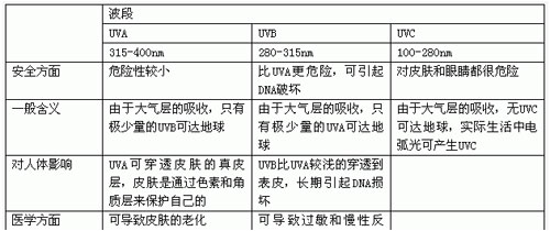 紫外線按照其輻射波長的不同,可以劃分成紫外A(波長為315?400nm)、紫外B(波長為280?315),以及紫外C(波長在280cm以下)三個(gè)波段。由于大氣臭氧層對(duì)紫外A的吸收很少,所以紫外A可以到達(dá)地面,其輻射量的變化基本上同臭氧層的變化沒有關(guān)系;而紫外C則同紫外A完全相反,它幾乎完全被臭氧層所吸收,所以它基本上不到達(dá)地面;而紫外B的輻射量同臭氧層的變化有著密切的關(guān)系,對(duì)人類也有較大的影響。紫外線的分布及對(duì)人體的影響可歸納如表1。